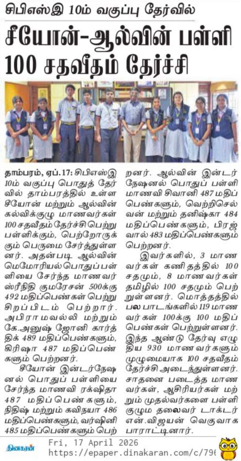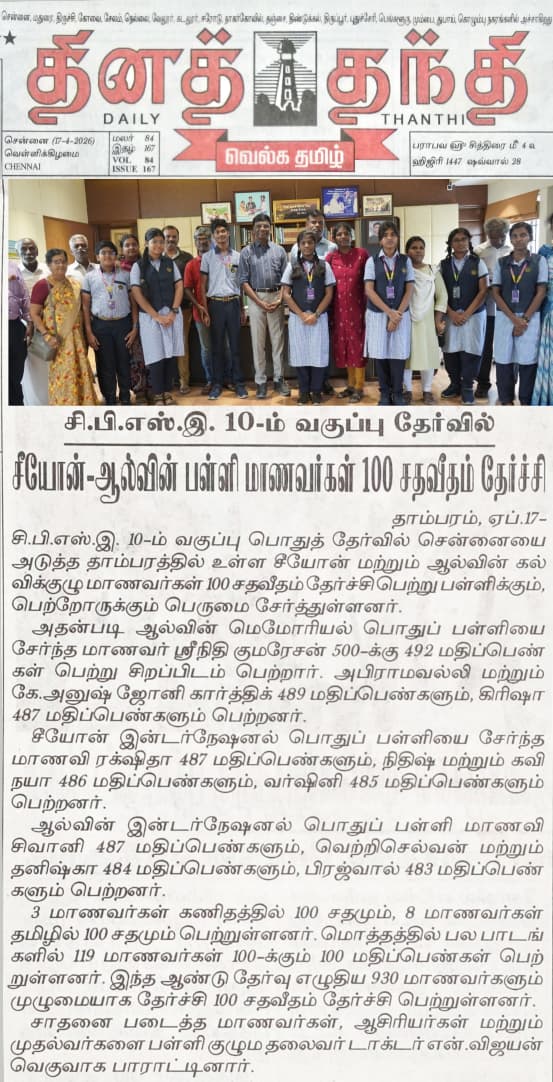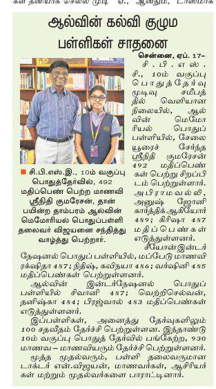 Newspaper clipping showcasing the academic achievement of Zion and Alwin Group of Schools students in the Class 10 board exams.